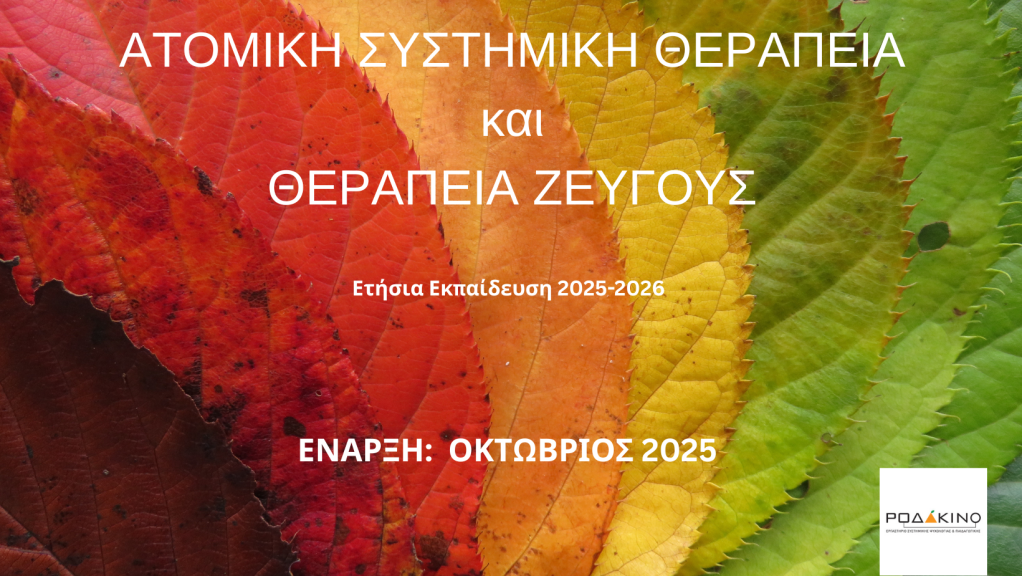 Το Εργαστήριο Συστημικής Ψυχολογίας και Παιδαγωγικής ΡΟΔΑΚΙΝΟ ανακοινώνει για την περίοδο 2025-2026 για 5η χρονιά την έναρξη ετήσιου εκπαιδευτικού προγράμματος με θέμα: ΑΤΟΜΙΚΗ ΣΥΣΤΗΜΙΚΗ ΘΕΡΑΠΕΙΑ ΚΑΙ ΘΕΡΑΠΕΙΑ ΖΕΥΓΟΥΣ διάρκειας 100 ωρών (θεωρητική κατάρτιση+εποπτεία περιστατικών)